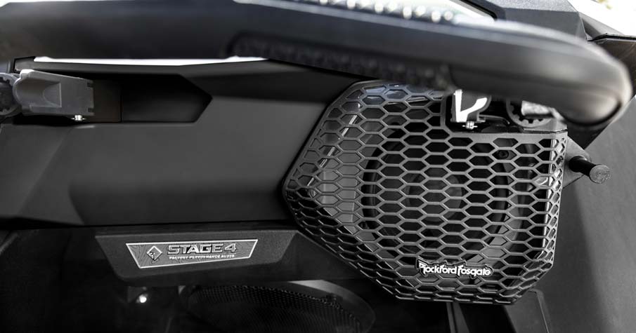- Factory Tuned & Integrated Rockford Fosgate Stage 4 Audio System with RIDE COMMAND Source Unit. Includes (2) 100 watt 1-inch tweeters, (2) 100 watt 6.5-inch component front speakers, (2) 100 watt 6.5-inch coaxial rear speakers, (1) 400 watt 4-channel amplifier, and (1) 10-inch subwoofer with an integrated 400 watt subwoofer amplifier. *Audio System is IPX7 and IPX9K water immersion tested to withstand the wet elements.
